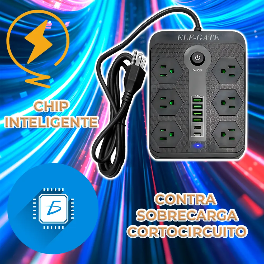 - 6 Clavijas Universales: Admite enchufes de diferentes estándares internacionales, lo que lo convierte en una opción versátil para todo tipo de dispositivos eléctricos.