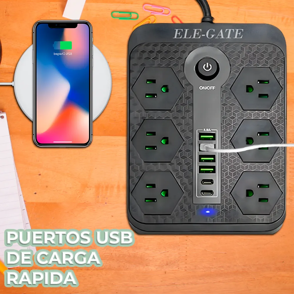 El Multicontacto de Alimentación Universal con 6 Clavijas, 4 Puertos USB y 2 Puertos Tipo C es la solución perfecta para quienes necesitan cargar y conectar varios dispositivos a la vez, garantizando velocidad, seguridad y versatilidad en un diseño moderno y funcional.