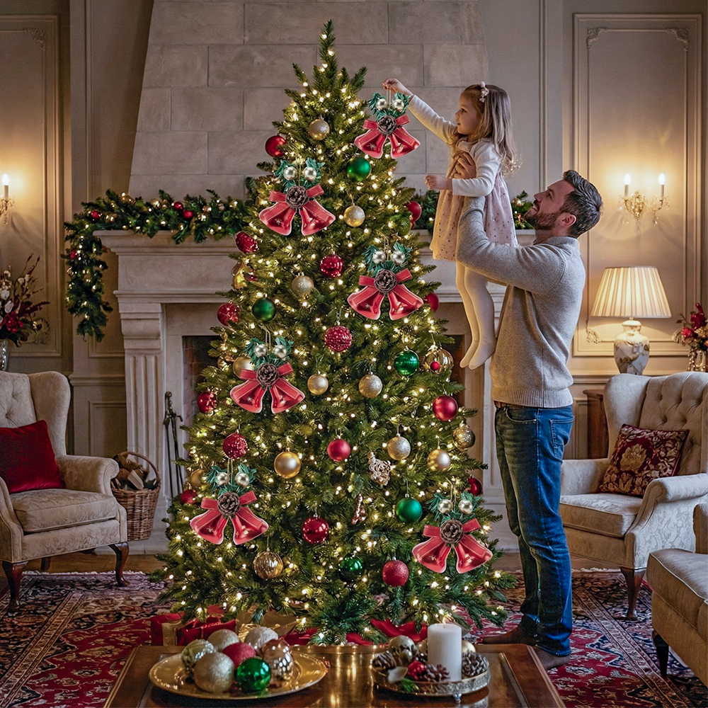 🎄 Diseño clásico navideño: Dos campanas rojas con acabado brillante y detalles realistas.