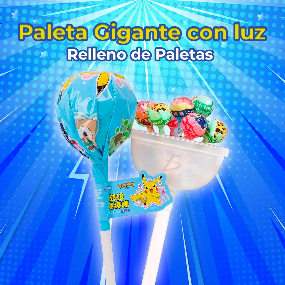 Paleta gigante de Pikachu con 10 paletas tipo lollipop de sabores variados y pelota con luz LED incluida. Dulce infantil con envoltura temática de Pokémon, ideal como regalo para niños, cumpleaños, fiestas infantiles, piñatas y celebraciones especiales. Perfecta para consentir a grandes y pequeños con una presentación colorida, divertida y lista para regalar.