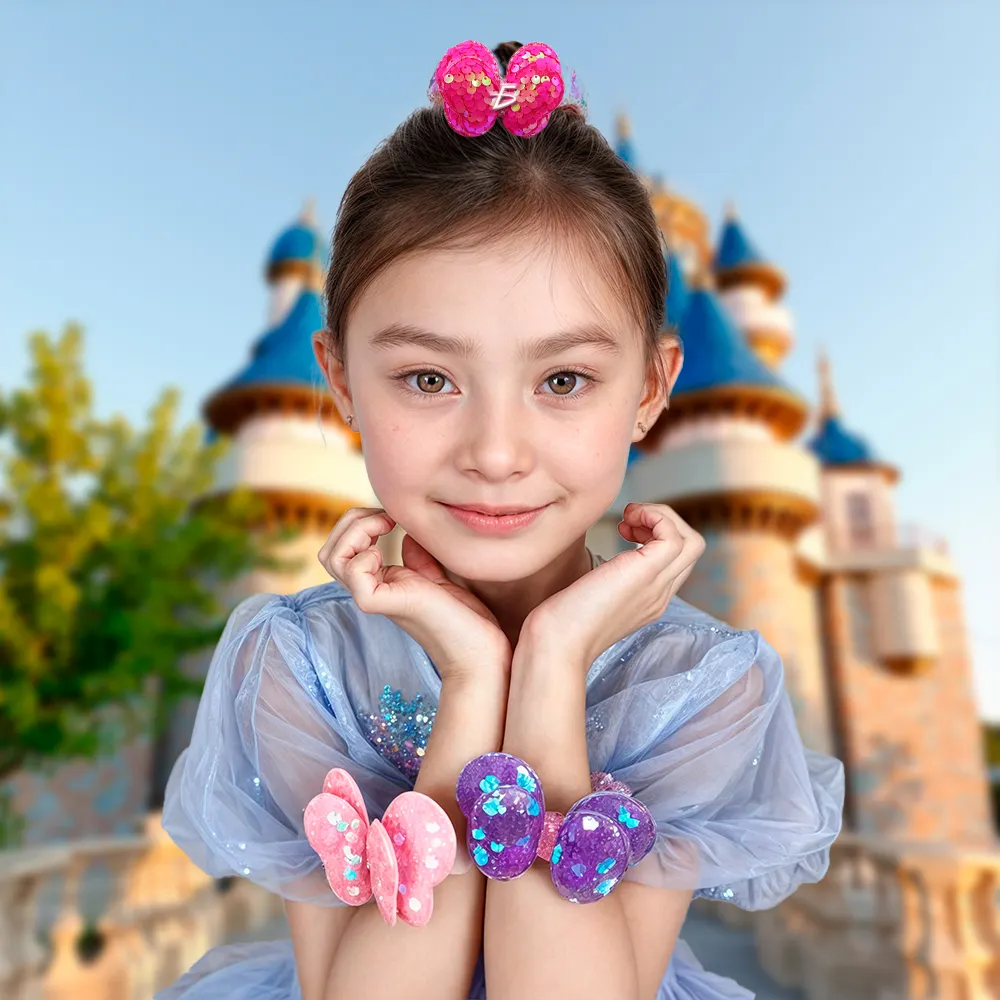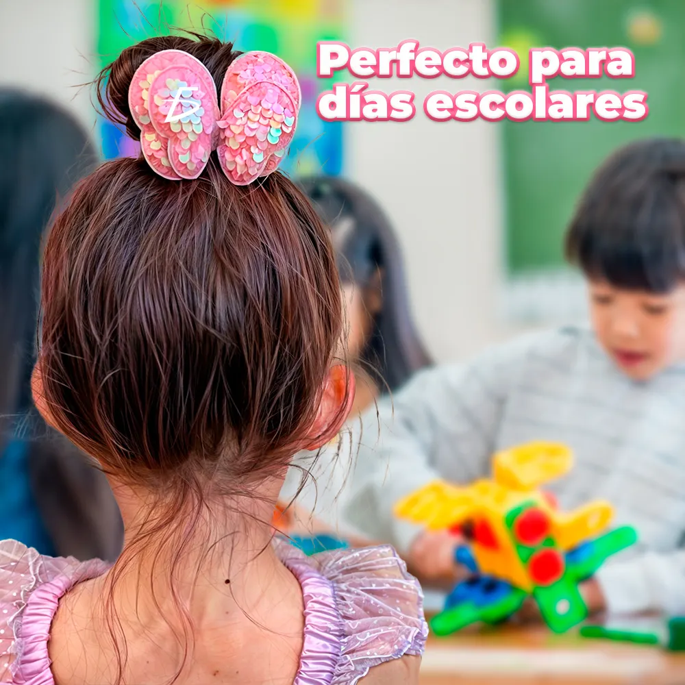 Paquete de 4 Moños con liga con Diseño de Mariposa Brillante Coquete . Ideal para combinar con tu vestido o atuendo favorito y brillar en la escuela o en tus reuniones.