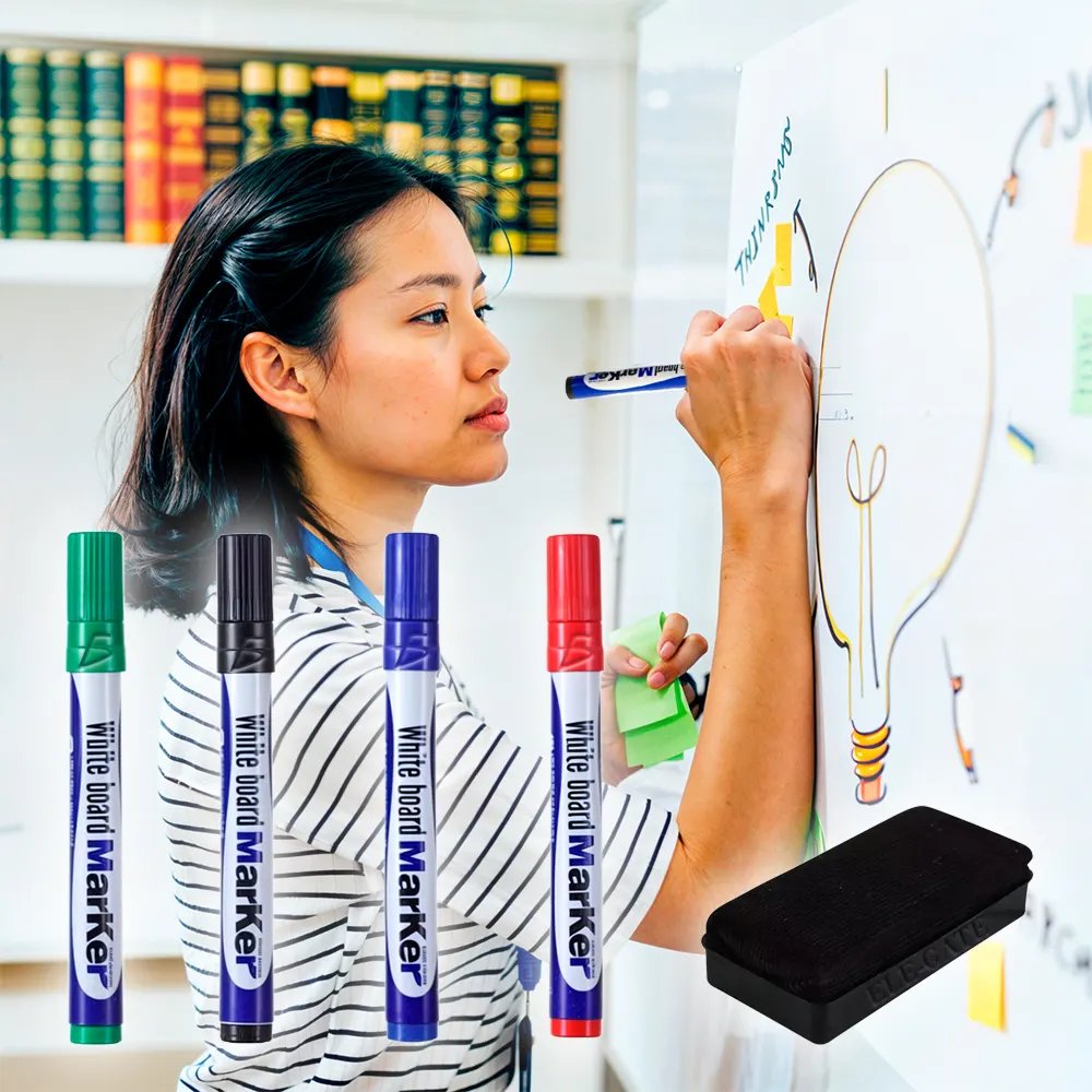 Paquete de 4 Plumones para Pizarrón Blanco con Borrador. Colores: Rojo, Verde, Azul y Negro