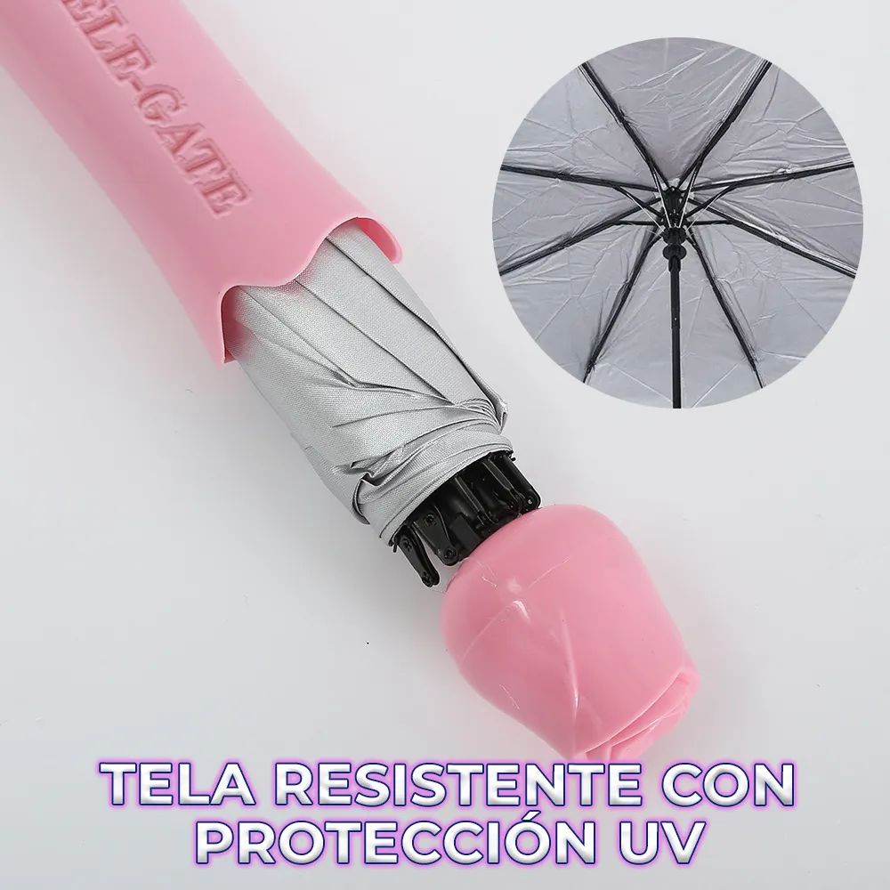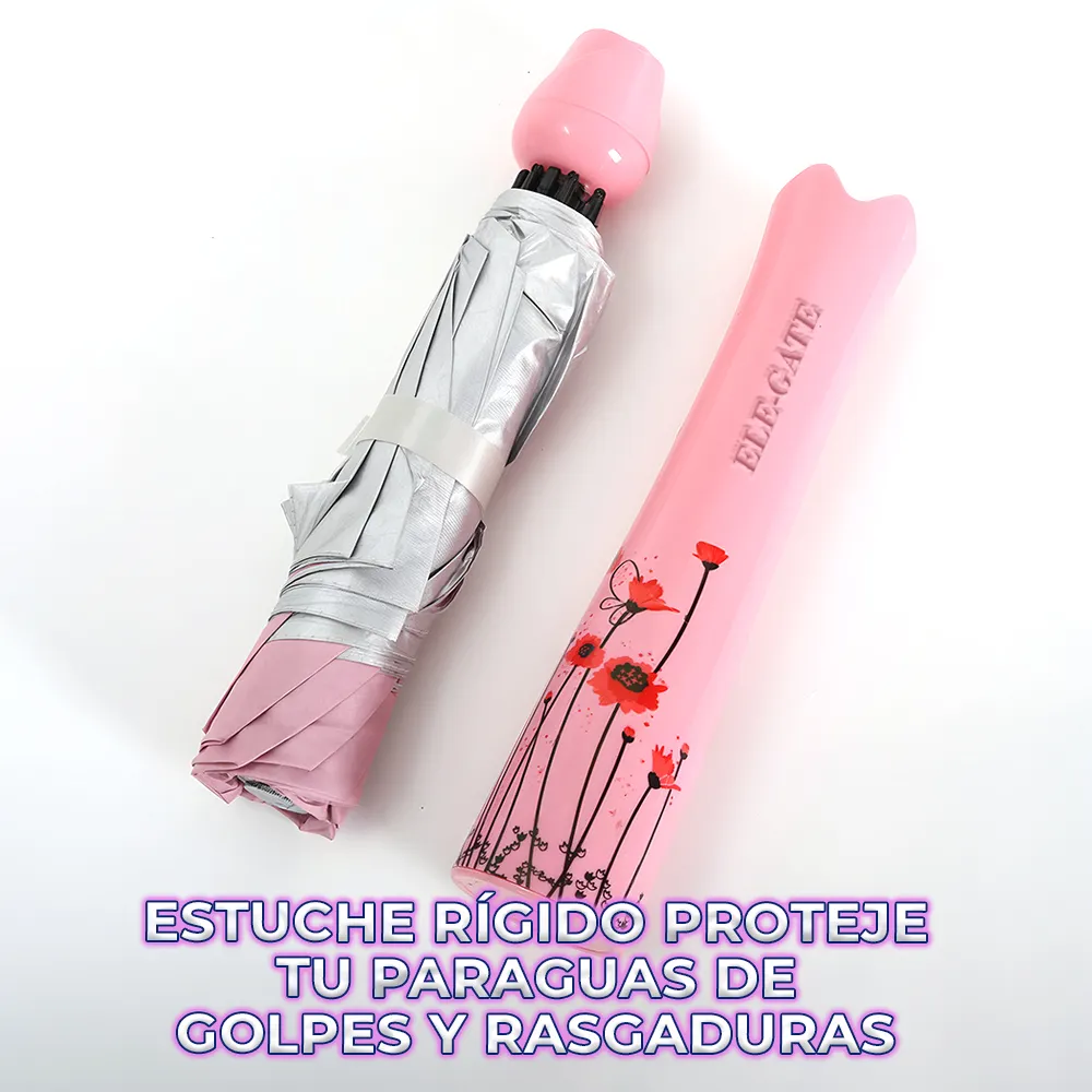 Este paraguas abatible es la opción perfecta para protegerte de la lluvia y el sol con estilo. Su diseño innovador cuenta con un mango en forma de flor que le da un toque elegante y coqueto a tu apariencia.