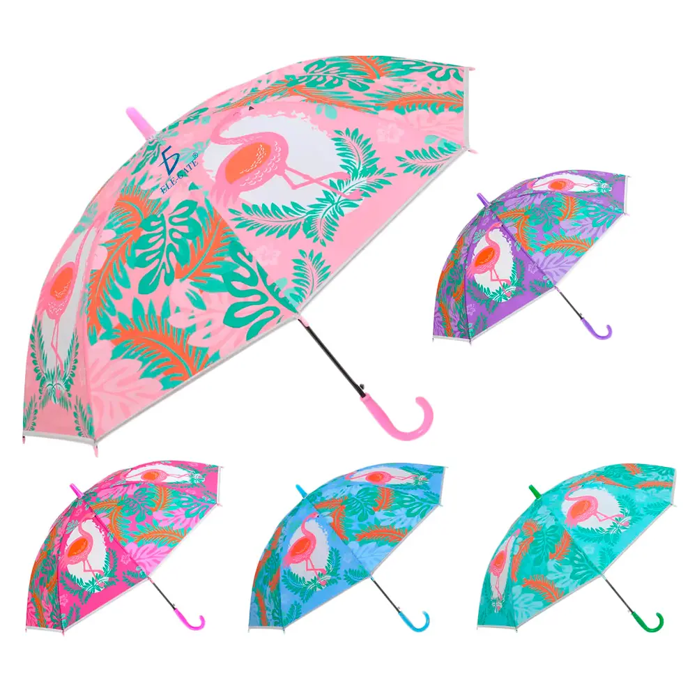 Paraguas con Proteccion UV Impermeable con Diseño Tropical en colores divertidos . Protege a tus peques de la lluvia y de los daniños rayos UV. Con su tela resistente y su varillas que aguantan fuertes vientos.