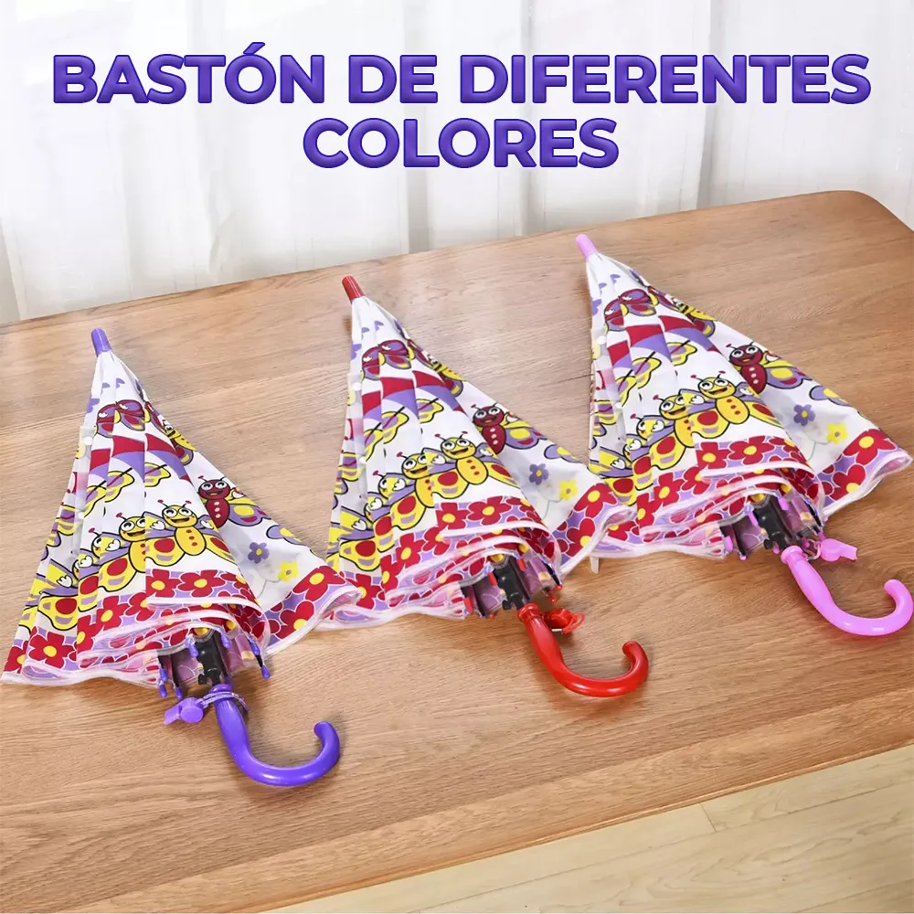Paraguas con Proteccion UV y Tela Repelente al Agua con diseño Coquete. Con varilla resistente y mango ergonomico que incluye silbatos para la diversión de los pequeños.