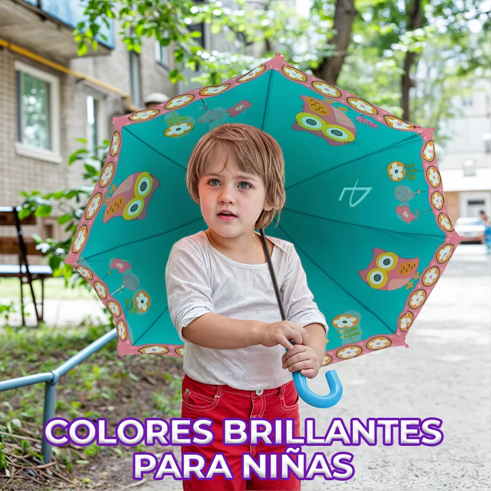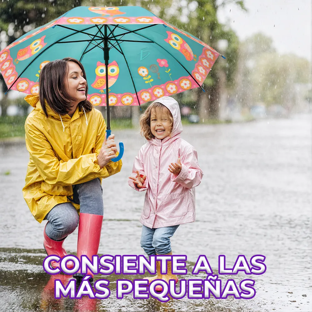 Paraguas con Proteccion UV y Tela Repelente al Agua con diseño Coquete. Con varilla resistente y mango ergonomico que incluye silbatos para la diversión de los pequeños.
