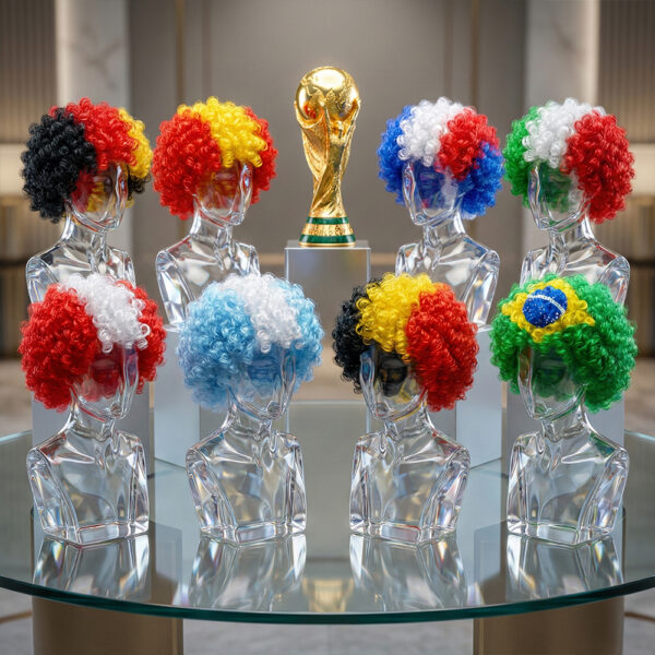 Conviértete en la sensación del estadio con esta peluca con colores de equipos mundialistas ⚽. El accesorio perfecto para demostrar tu pasión por tu selección y vivir al máximo la emoción de cada partido.
