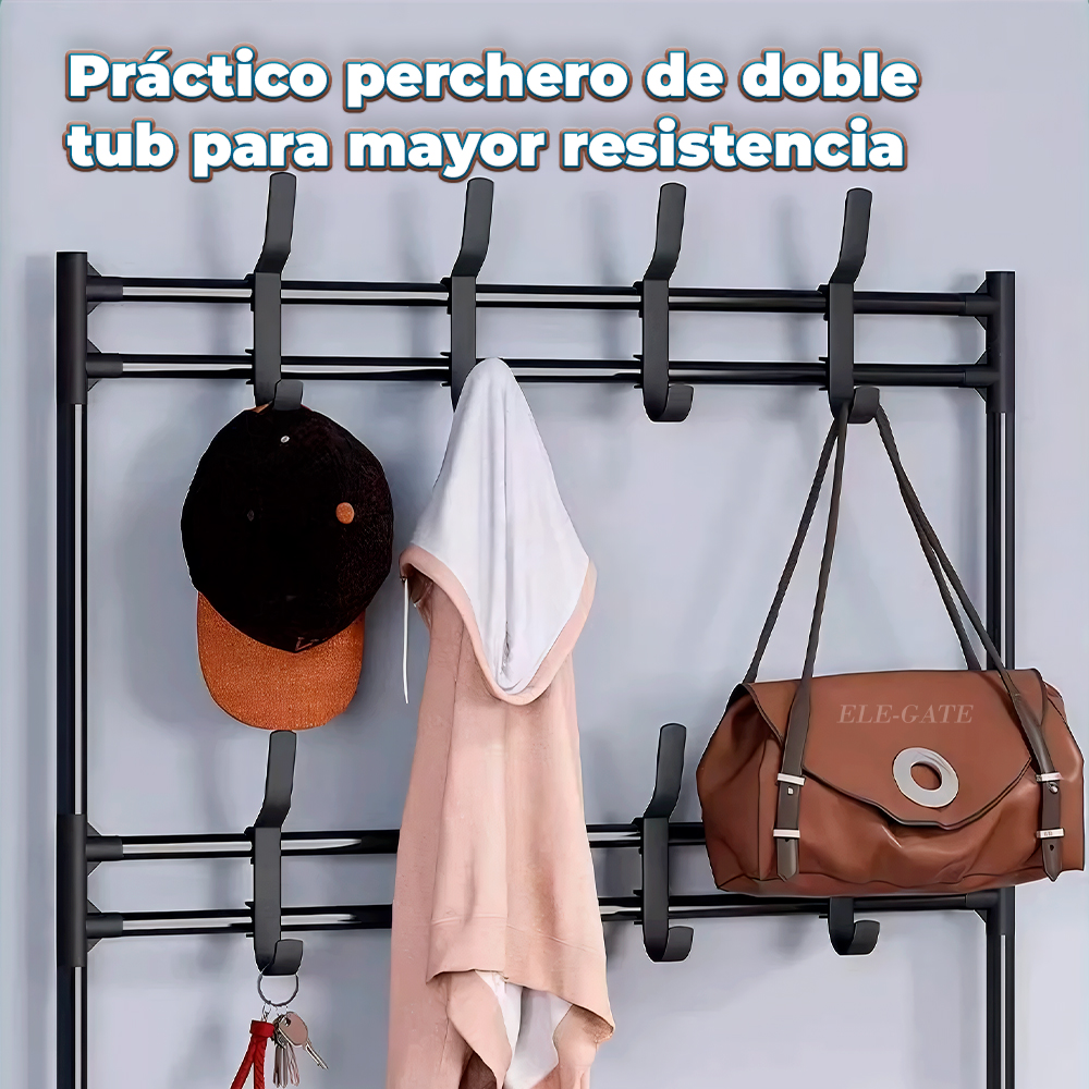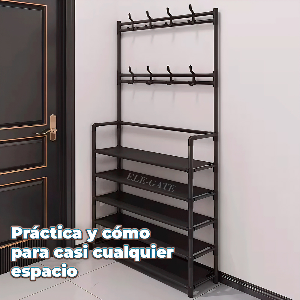 Integra perchero, barra para colgar ropa y zapatera para mantener abrigos, bolsos, zapatos y accesorios perfectamente organizados. -