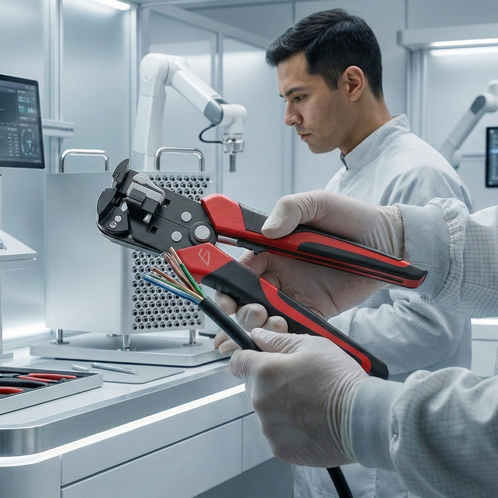 Herramienta 3 en 1: Pelado, corte y crimpado en un solo dispositivo.