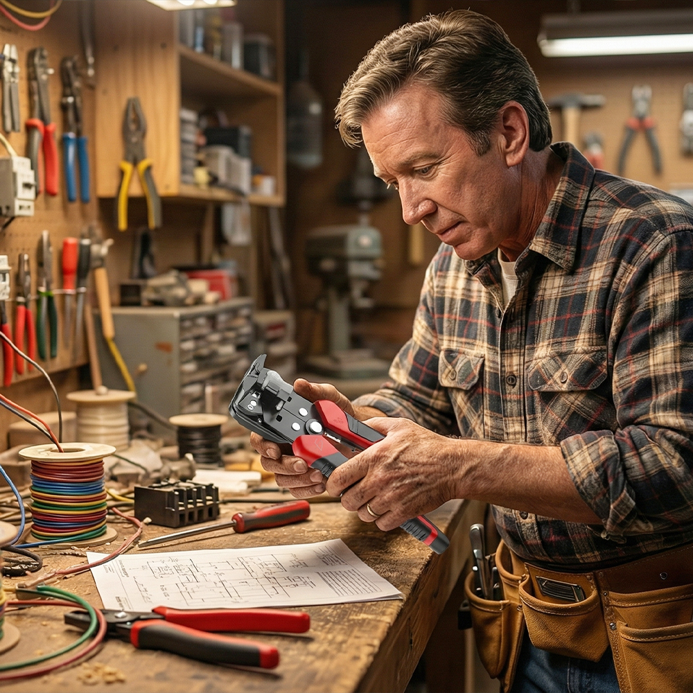 Pelacables autoajustable: Pela y corta con precisión distintos tipos de cables sin dañar el conductor. Ideal para trabajos rápidos y limpios.