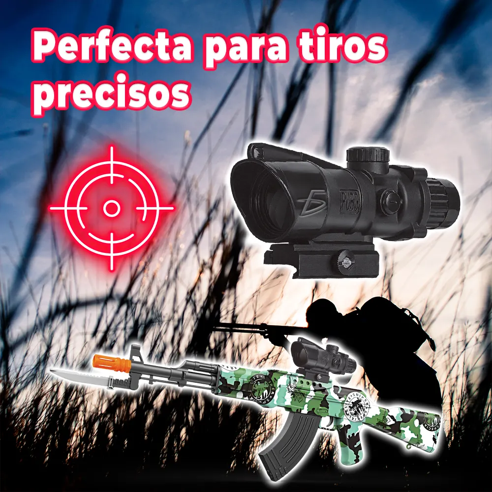 Pistola de Hidrogel con un diseño replica de la legendaria AK 47 con bayoneta de plástico suave. Disparos super rápidos de mas de 500 balas de hidrogel por minuto. Con mira y cargador rapido.