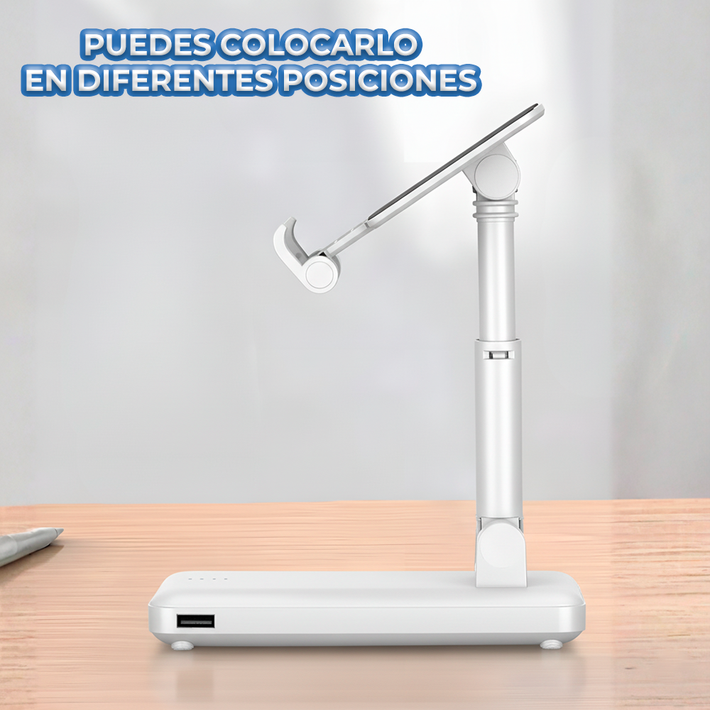 Con cables USB, Lightning, Tipo C y Micro USB, podrás cargar cualquier dispositivo sin necesidad de accesorios externos, disfrutando al mismo tiempo de tus series o redes sociales gracias a su práctica base para celular.