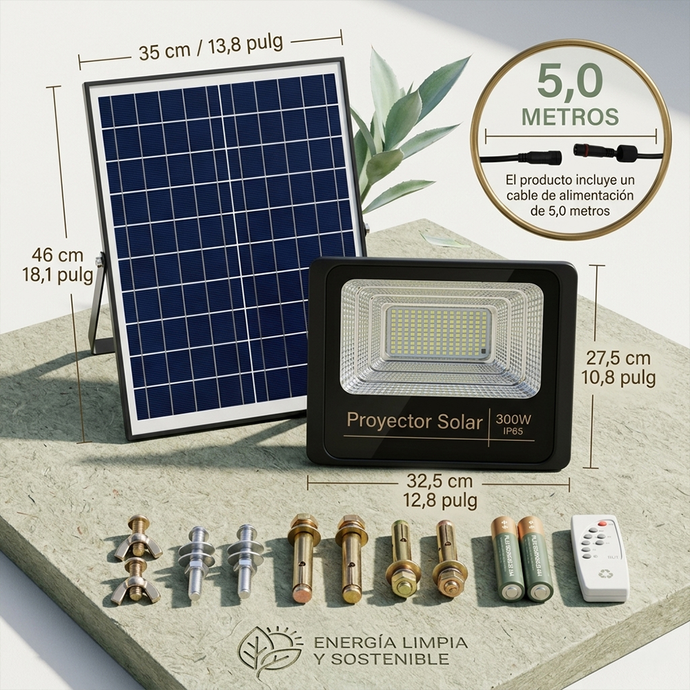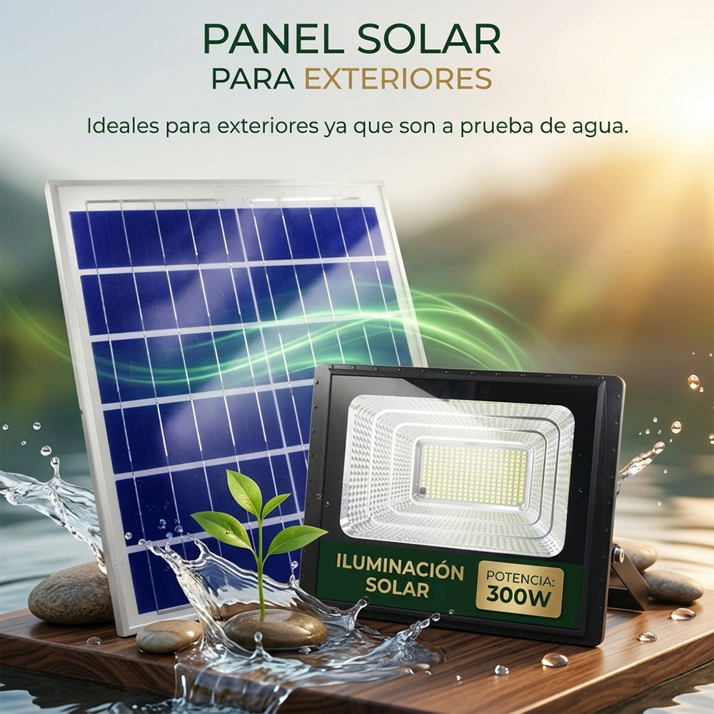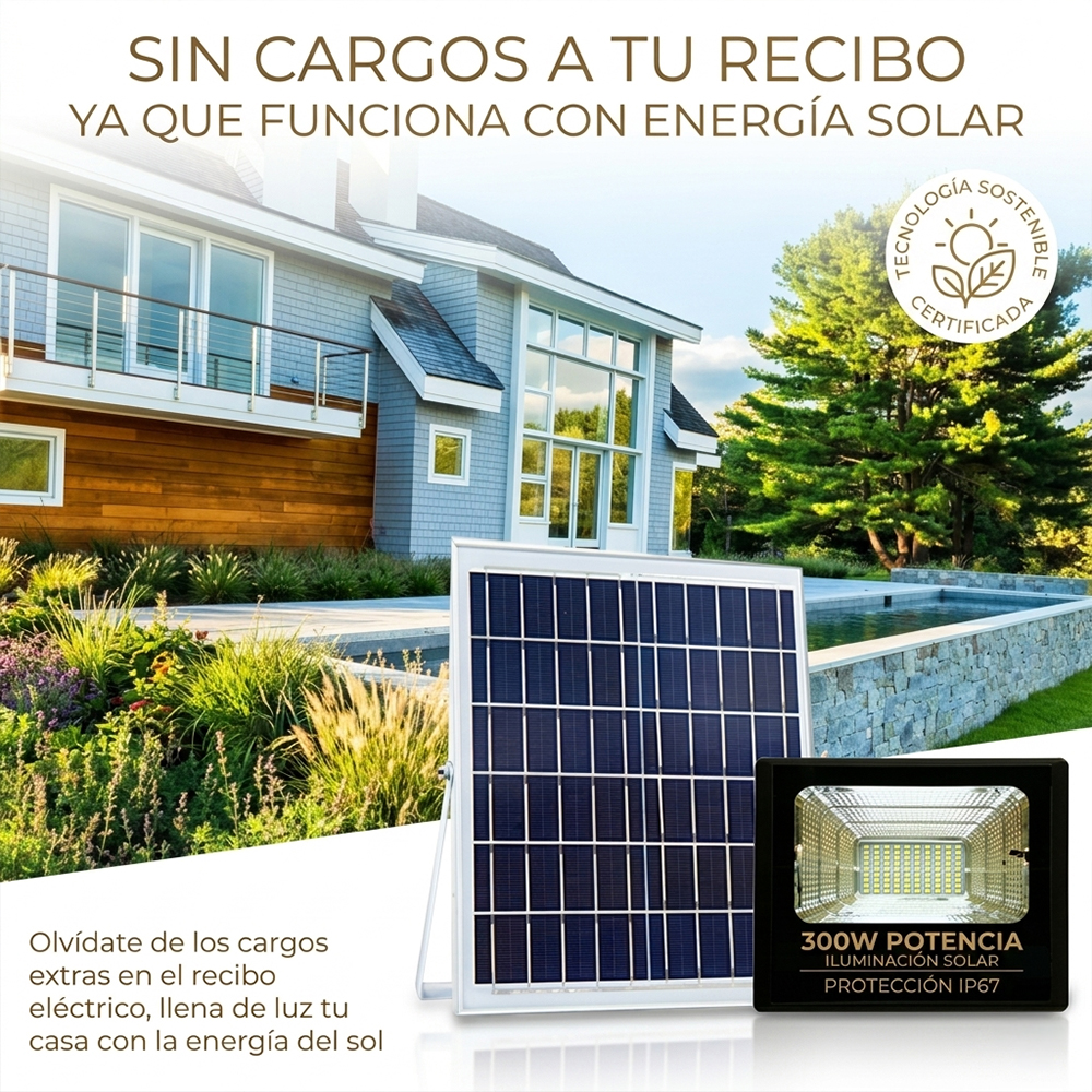 Ilumina tus espacios exteriores de forma eficiente con el Reflector LED Solar 300W con panel solar y control remoto. Diseñado para ofrecer una iluminación potente de luz blanca, es ideal para áreas como patios, jardines, entradas, terrazas, cocheras y exteriores del hogar o negocio.