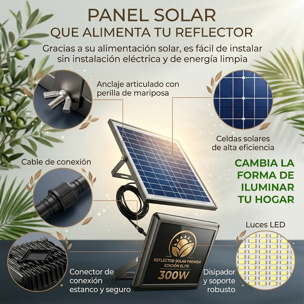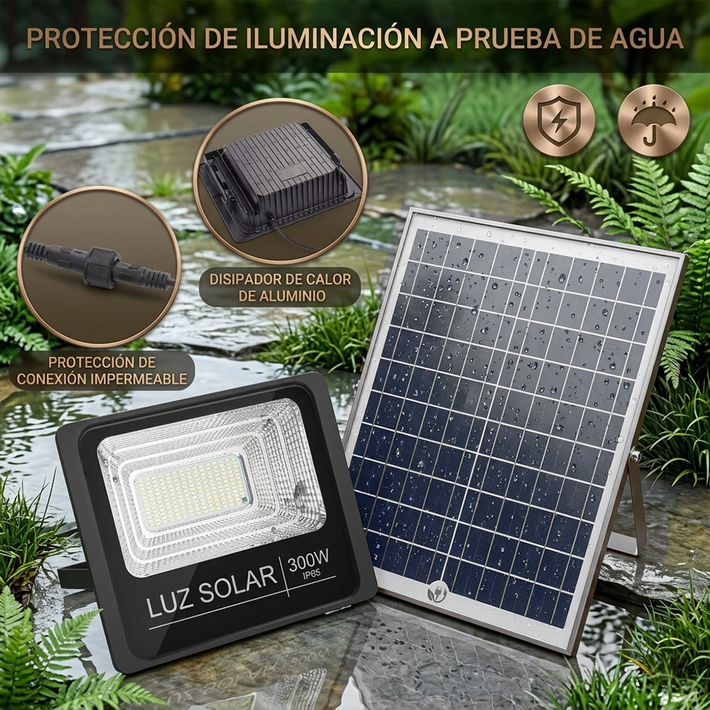 - Iluminación potente para exteriores: Reflector LED solar de 300W con luz blanca de alta intensidad, ideal para iluminar patios, jardines, cocheras, entradas, terrazas y fachadas.