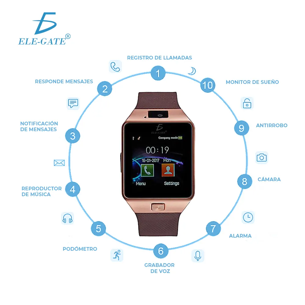 La meta es promover el Reloj Celular SIM Smartwatch DZ09 como una solución inteligente para aquellos que buscan un dispositivo versátil que combine las funciones de un reloj, teléfono y cámara inteligente. Destacar sus características clave, como la compatibilidad con tarjeta SIM para llamadas independientes, la capacidad de capturar fotos y videos con su cámara integrada, y su conectividad Bluetooth que permite sincronizarse con teléfonos inteligentes Android para recibir notificaciones y controlar ciertas funciones. Se enfatizará la conveniencia y la practicidad que ofrece este reloj inteligente para la vida diaria y el monitoreo de la actividad física.
