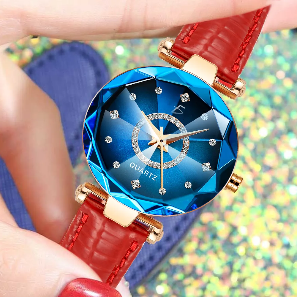 - * Cielo estrellado Diseño: Dial cielo estrellado de diamante simulado clásico, elegante diamantes de imitación incrustada, muy de moda y romántico.El polvo brillante en el dial cambiará de color en virtud de las diferentes luces y puntos de vista
