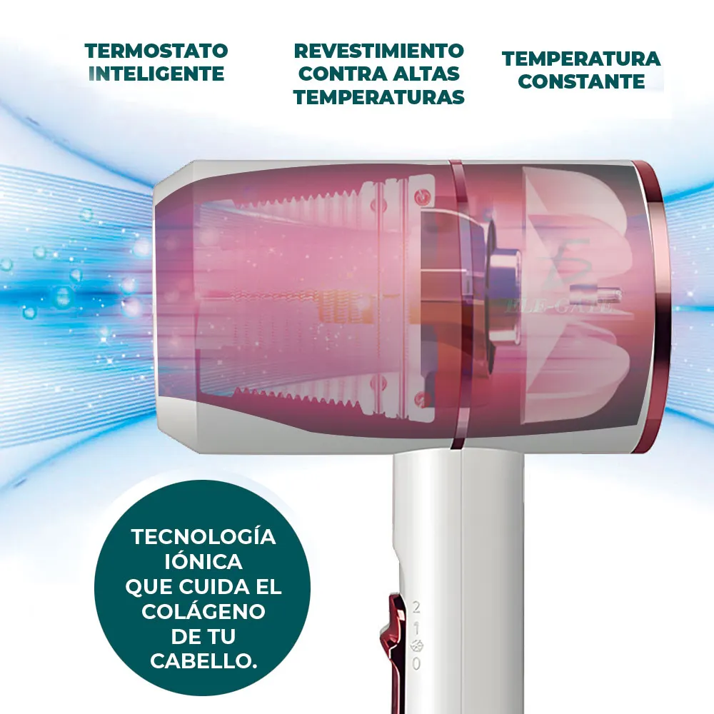 Su tecnología iónica cuida el colágeno de tu cabello Función: anión, aire caliente y frío, temperatura constante, protección contra sobrecalentamiento