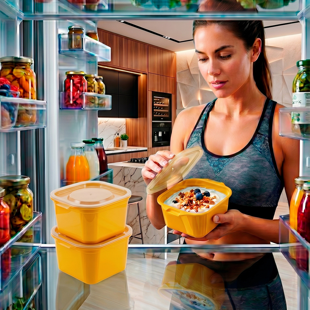 Su tamaño compacto es perfecto para porciones individuales, snacks, salsas o pequeños alimentos, mientras que sus colores sólidos permiten una organización más eficiente y rápida identificación de contenidos.