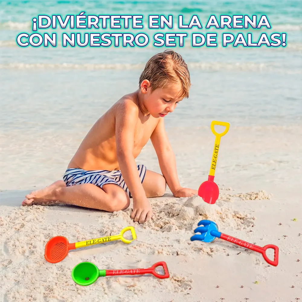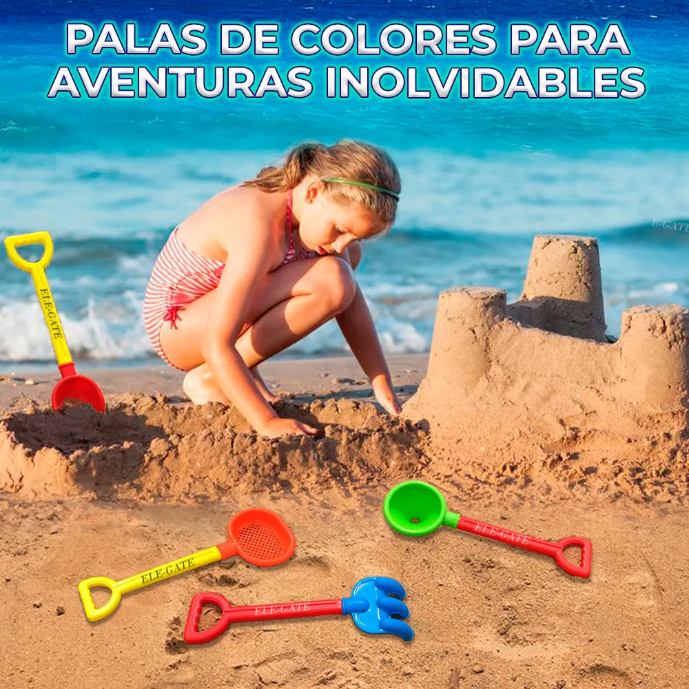 Set de 4 palas para playa, incluye pala colador, pala reloj de arena, pala cuchara y pala tridente. Ideal para completar tus set de playa y hacer mas fácilmente tus castillos de arena