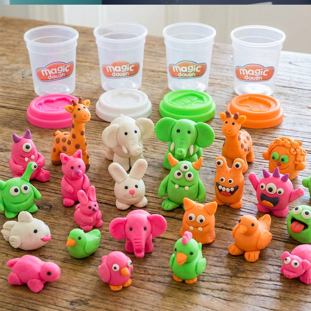 🧩 Tapa con molde integrado: Cada tapa trae un molde diferente para crear figuras relacionadas con el color del bote, haciendo el juego más divertido e interactivo.