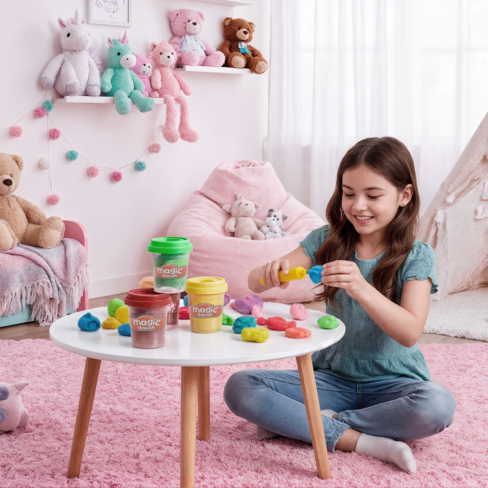 Deja volar la imaginación de los pequeños con este Set de 4 Plastilinas tipo Play Doh, perfecto para crear, moldear y jugar por horas. Cada bote incluye plastilina con textura suave y fácil de manipular, ideal para manos pequeñas que están descubriendo el mundo de las formas y los colores.