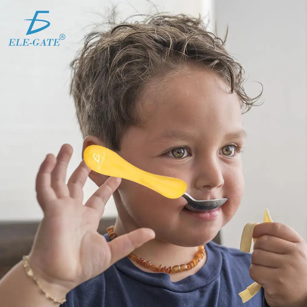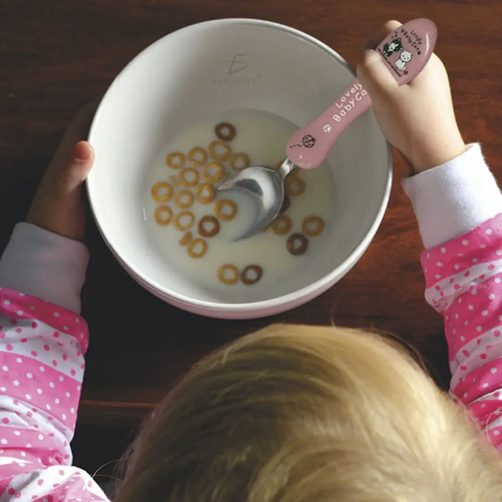 Anima a los niños a comer de forma independiente imitando los cubiertos de acero inoxidable utilizados por adultos.