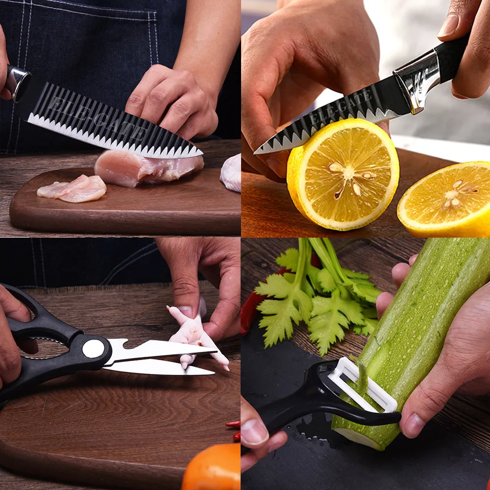 - 【Juego de Cuchillos de Cocina Multifuncional】Incluye: 1 cuchillo de chef, 1 cuchillo Santoku , 1 cuchillo de cocina, 1 tijeras de cocina multifuncionales 3 en 1 y 1 cuchillo para pelar peladores y base. Adecuado para cortar carne, verduras, frutas y pieles, etc. Para todas sus necesidades de cocina.