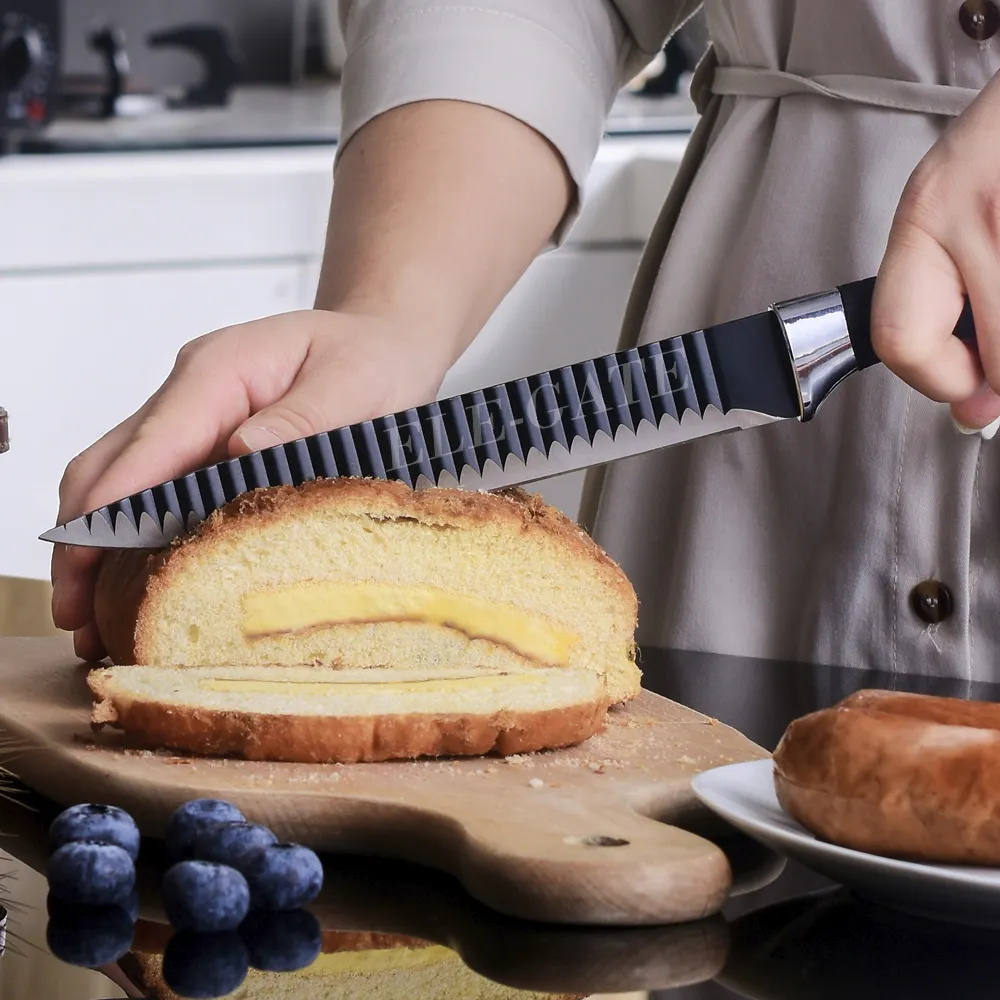 - El diseño ergonómico de los mangos le permite usar menos esfuerzo y proporciona un agarre cómodo y antideslizante. El patrón moderno agrega textura a la cuchilla y combina con el estilo de su cocina.