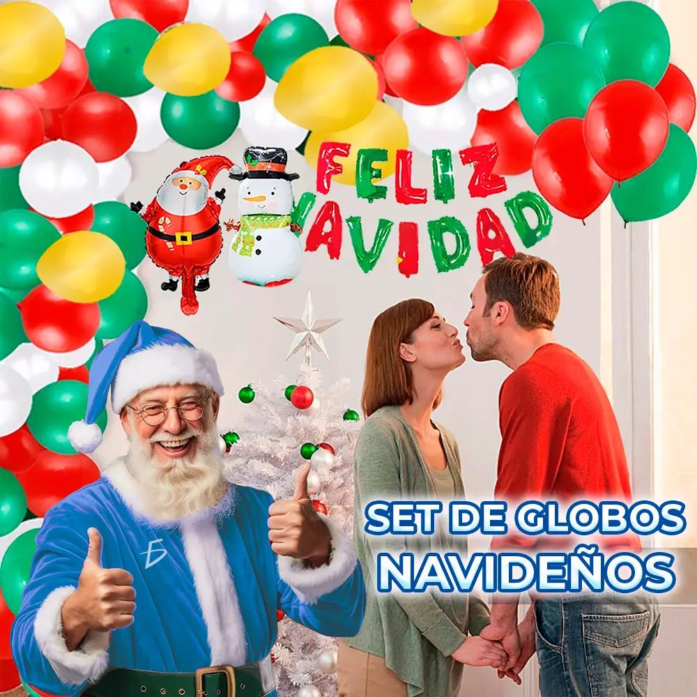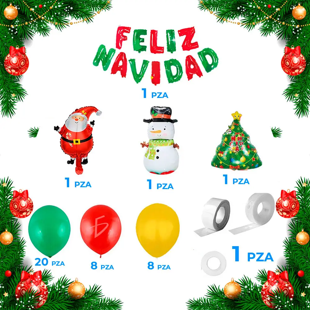 - Incluye globos con letras para formar ‘Feliz Navidad’, Santa, muñeco de nieve y árbol de Navidad.