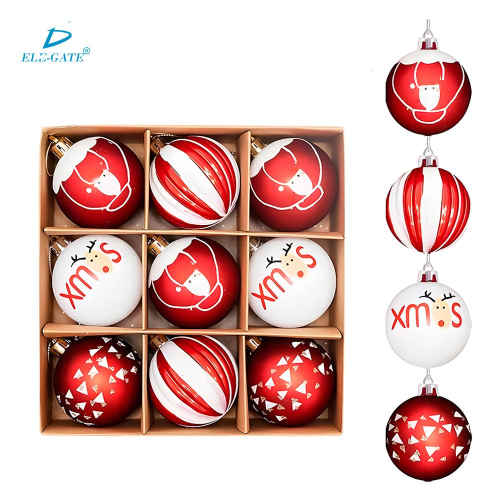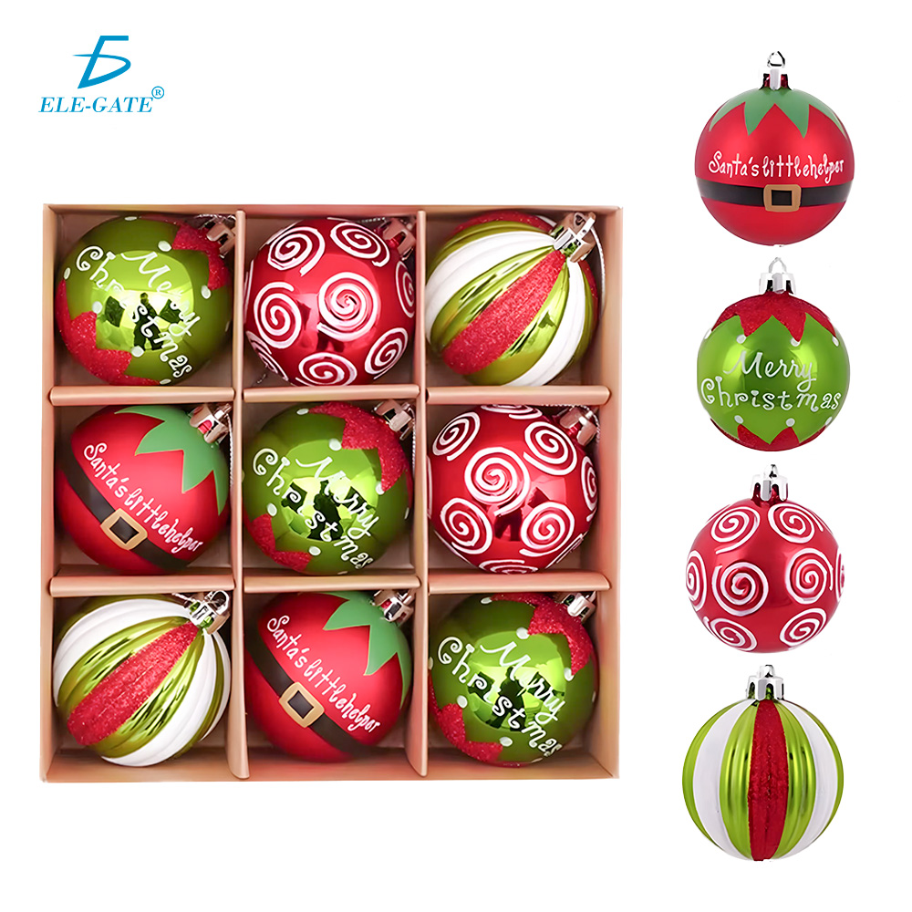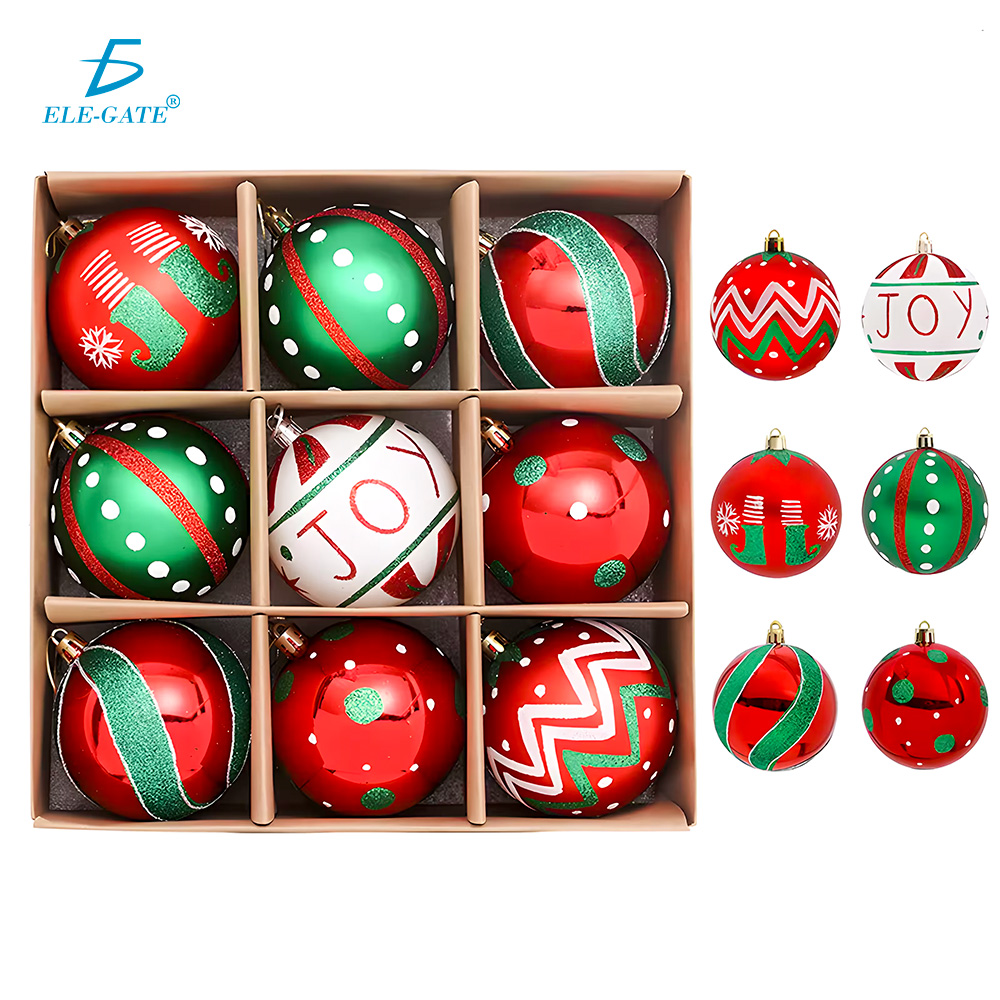 Set de esferas navideñas de plástico con acabado tipo cristal y detalles de brillantina en colores modernos.