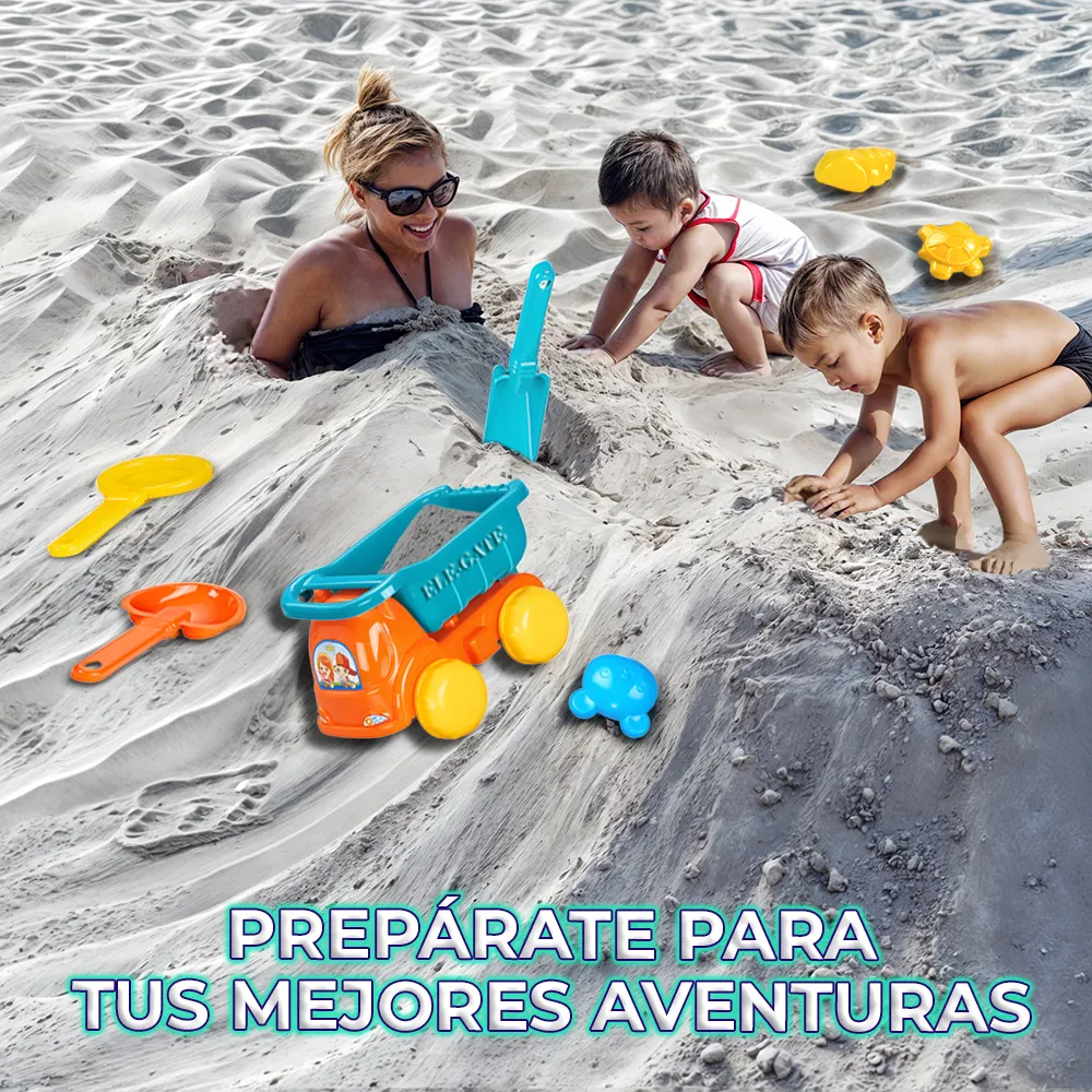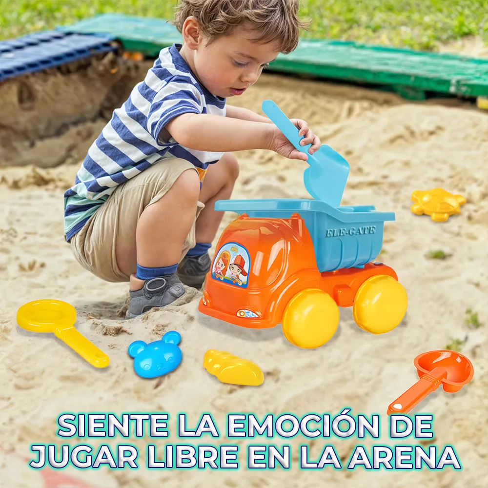 Set de Juego de Playa incluye camión con caja movible, tres palas y tres moldes. El regalo ideal para que tu pequeño se divierta en las vacaciones o viajes familiares.