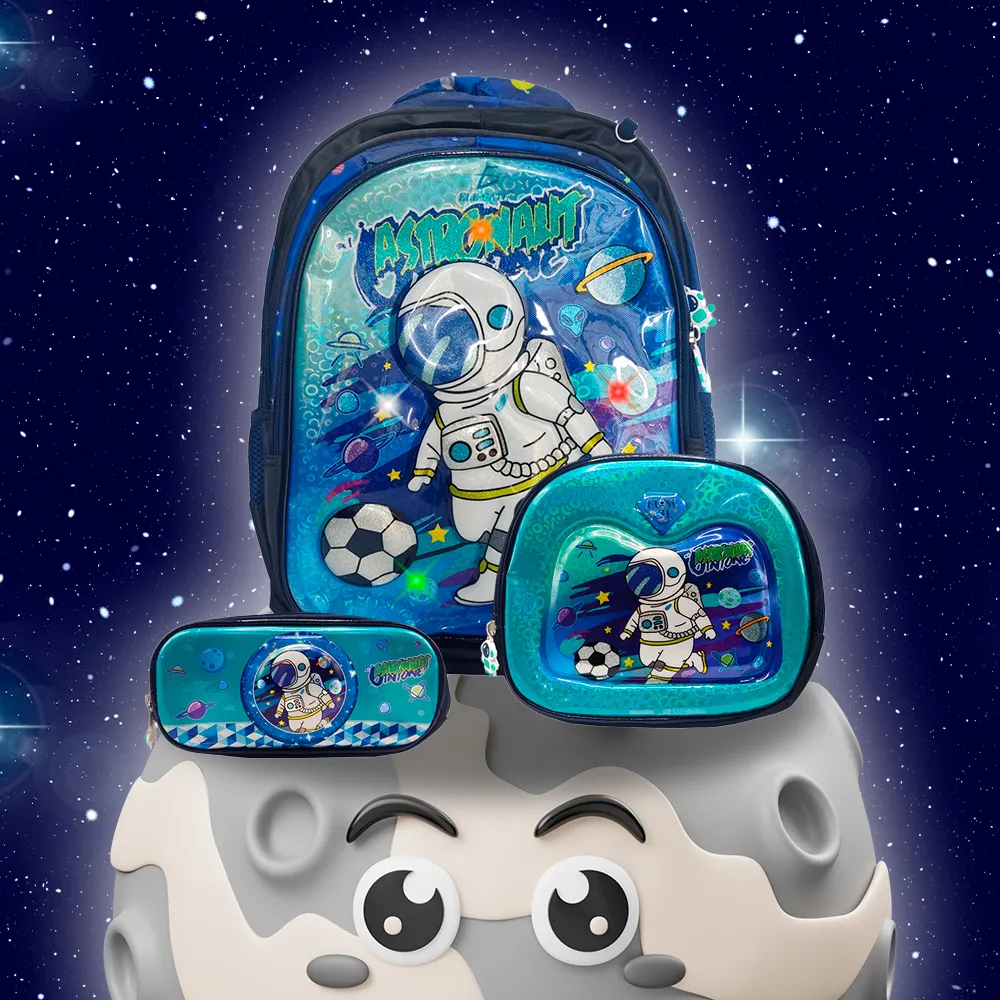 Descubre nuestro completo set escolar galáctico que incluye mochila, lapicera y lonchera térmica, todos diseñados para hacer brillar a tus pequeños en el colegio. La mochila está decorada con estampados galácticos que activan luces LEDs RGB al tacto, creando un efecto visual impresionante. La lapicera complementa el conjunto con su diseño coordinado y funcionalidad para organizar los útiles escolares.