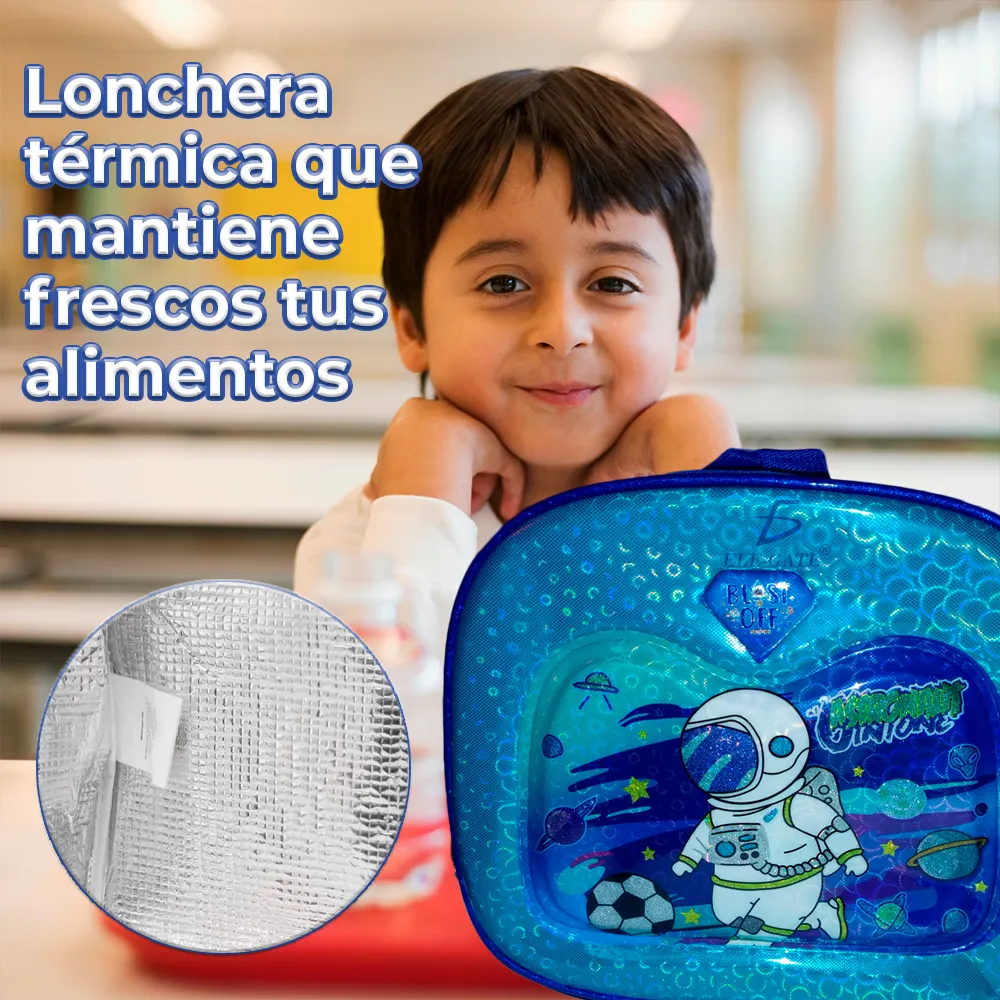 La lonchera térmica mantiene la comida fresca y cuenta con luces LEDs RGB que añaden un toque divertido y seguro. Ideal para niños que adoran el espacio y quieren destacar con estilo. Asegura que cada día escolar sea emocionante y lleno de color con nuestro set galáctico. ¡Compra ahora y deja que tus pequeños brillen en cada aventura escolar