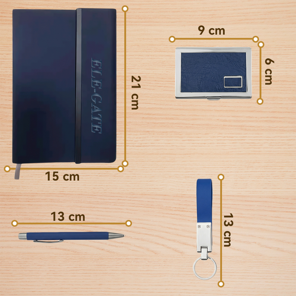 Set completo 4 en 1: Incluye libreta con acabado tipo piel, tarjetero metálico, llavero elegante y pluma tipo fuente con ball pen.
