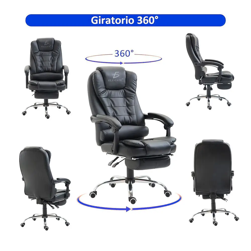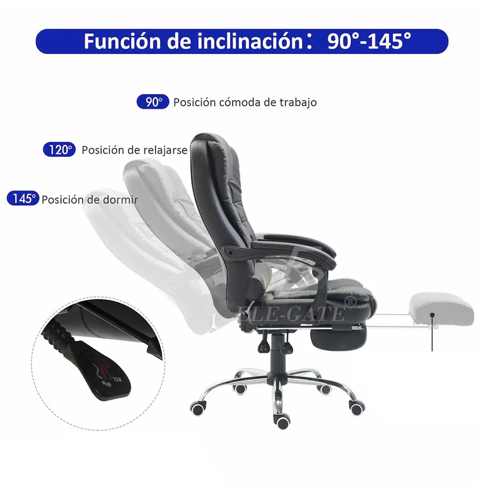 La altura del asiento es ajustable; inclinación de 90° – 135°; rotación de 360°, base de cinco puntos, alta resistencia.