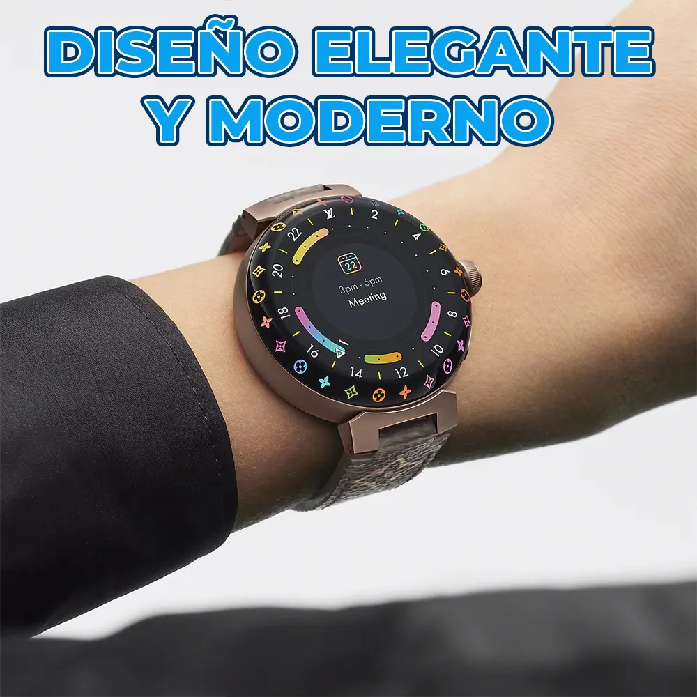 Elegante reloj inteligente con correa de alta moda. Organiza tus viajes, reuniones y agenda diaria con facilidad. Pantalla de alta definición con negros profundos y colores vibrantes. ¡Experimenta la tecnología con estilo!