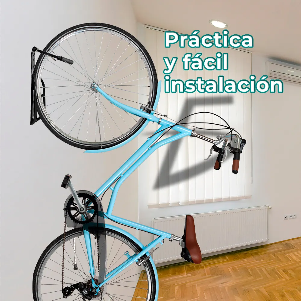Soporte Metálico de Pared para Bicicleta con acero reforzado y descansa llantas de Goma. Ideal para guardar en lugares pequeños o para ahorrar espacio al guardar tu bicicleta. Con su diseño compacto, se puede montar en cualquier pared. Con diseño antideslizante que evita caídas.