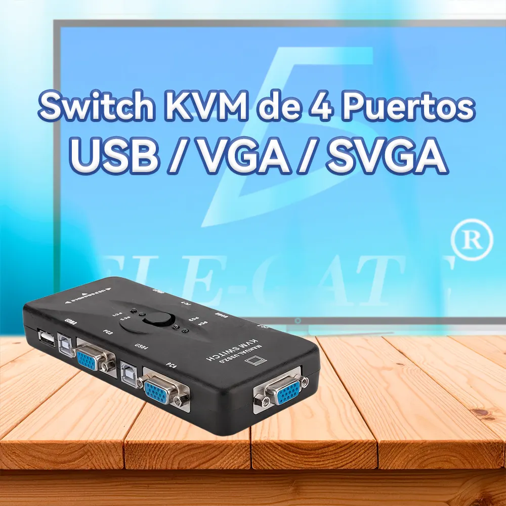 El Switch KVM de 4 Puertos USB VGA es la solución perfecta para usuarios que manejan múltiples computadoras y buscan optimizar su espacio de trabajo. Gracias a su tecnología plug & play, podrás controlar cuatro equipos usando solo un monitor VGA/SVGA y un set de teclado y ratón USB, sin necesidad de instalar software adicional.