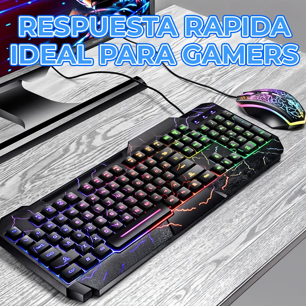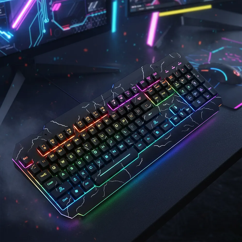 Lleva tus partidas al siguiente nivel con este teclado gamer mecánico con retroiluminación arcoíris. Sus teclas con efecto de grietas iluminadas, grabado láser de alta definición y amplio reposamuñecas te ofrecen comodidad, estilo y precisión en cada juego.