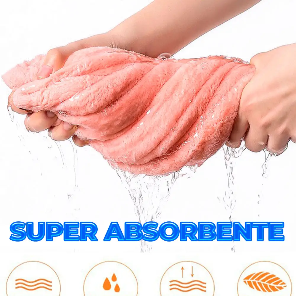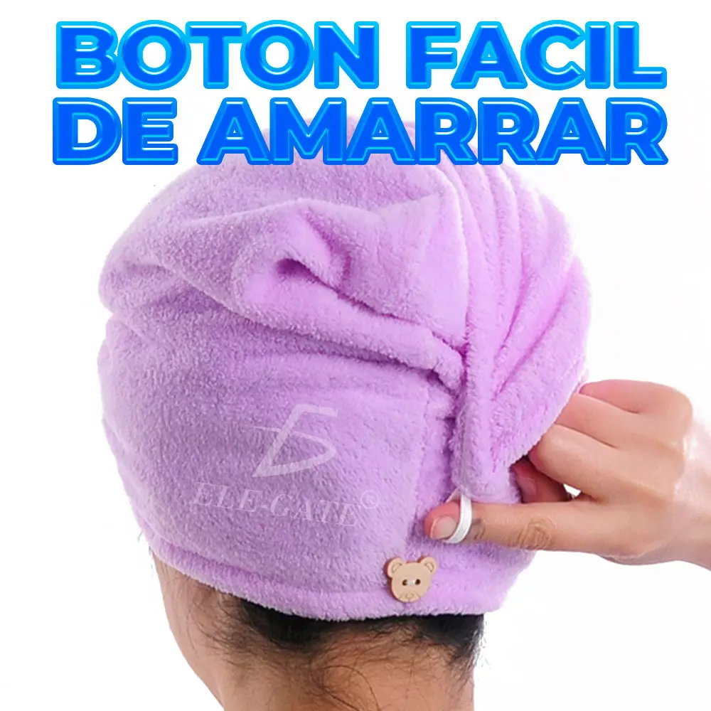 Fabricado con microfibra de alta calidad, este turbante es altamente absorbente y ayuda a secar tu cabello de manera rápida y suave. Su diseño con botón de cierre asegura un ajuste seguro, permitiéndote moverte con libertad mientras tu cabello se seca.