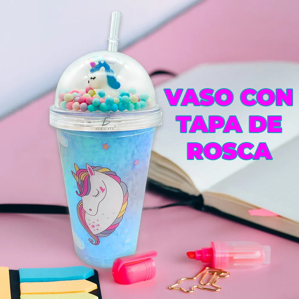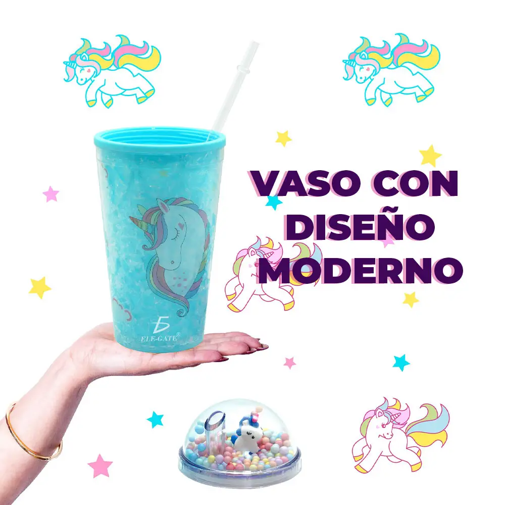 Excelente vaso para que las niñas puedan utilizarlo para sus bebidas favoritas, sin que se derrame ya que tiene una tapa de rosca y un popote para que lo puedan disfrutar al máximo. Vaso Con Popote Y Cúpula De Unicornio.