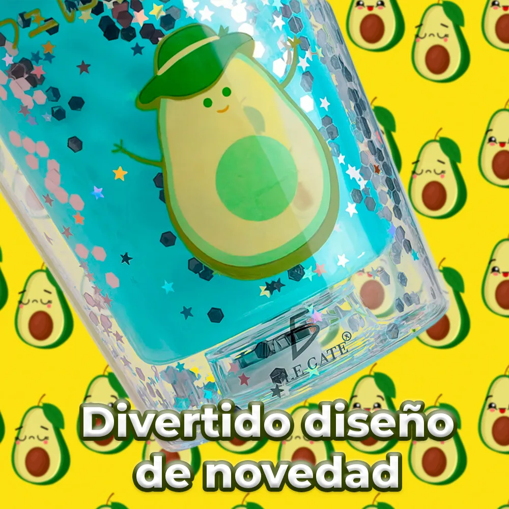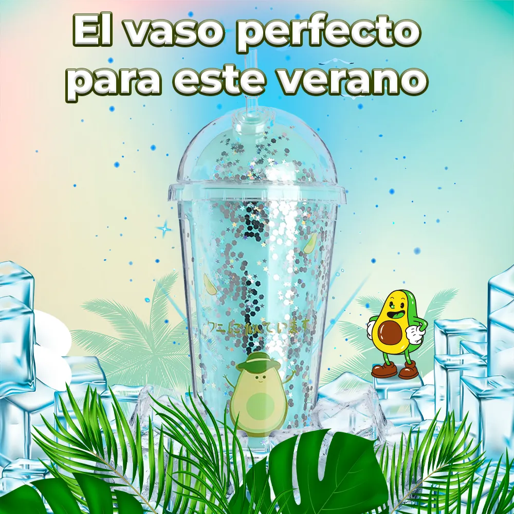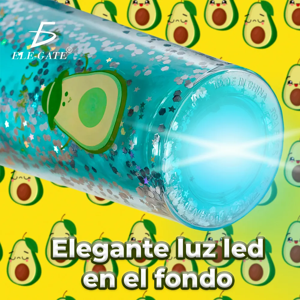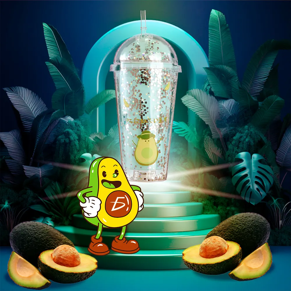 Vaso con tapa y popote de plástico trasparente con diseño de aguacate, ideal para enfriar tus bebidas favoritas. con luz led y con brillantina que le da un efecto fashion a tu vaso.