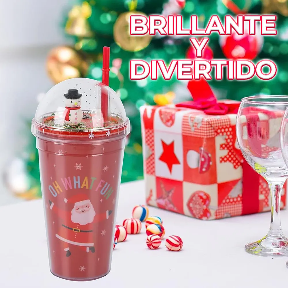 Vaso de Agua Navideño Muñeco 3D – Copa de Doble Pared con Purpurina, Tapa y Pajita Reutilizable sin BPA – 450 ml